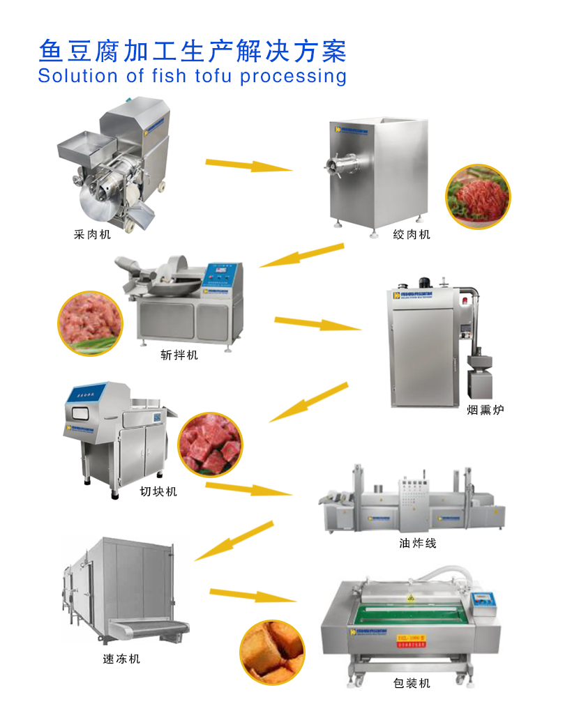 9、通過鏈條傳動到冷卻槽內的魚豆腐須在冷卻槽內迅速冷卻,冷卻槽內的水為開放型的,即進入冷水而溢出熱水已達到冷卻槽內水溫始終在20-25度左右。魚豆腐在冷卻槽內冷卻后可直接進入速凍車間掛冰冷凍。