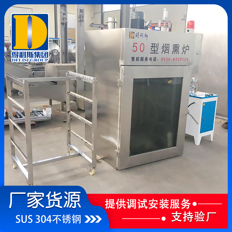 全自動煙熏爐的發煙系統: 外置式木粒、木屑發煙系統,不僅使產品產生果木香氣,而且可以使產品熏成由淺入深的金黃色。外置全自動煙熏爐分體式糖爐發煙系統,可熏制傳統的中式產品,產生糖熏味道,并且顏色可以控制,深可以成為棗紅色。兩種發煙系統同時使用能產生煙熏香氣和顏色。門上木粒發煙系統,采用世界上先 進的內循環發煙工藝,低氧狀態發煙,縮短煙道長度,降低能耗,減少設備占地面積。材質、保溫 箱體結構以單車為單元,可以拼裝成不同的組合。材質采用進口SUS304不銹鋼拉絲扳。保溫層采用進口聚氨酯保溫材料,耐高溫一次成型,保溫性能好。控制元器件 PLC、人機界面、電磁閥等關鍵元器件采用進口產品。加熱方式 采用外接蒸汽加熱或電加熱方式。配備在線清洗系統。門鎖和門合頁及密封條設計合理,密封嚴密,操作方便。生熟區門互鎖,區域隔離,符合HACCP要求。
